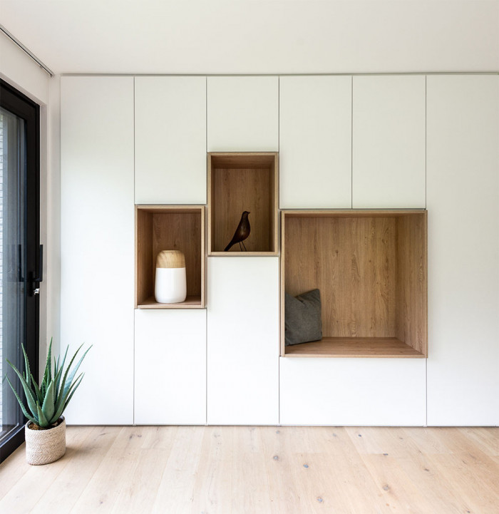 Het eenvoudige wit gecombineerd met de asymmetrische lichthouten accenten leunt dicht aan tegen de Japandi-trend.